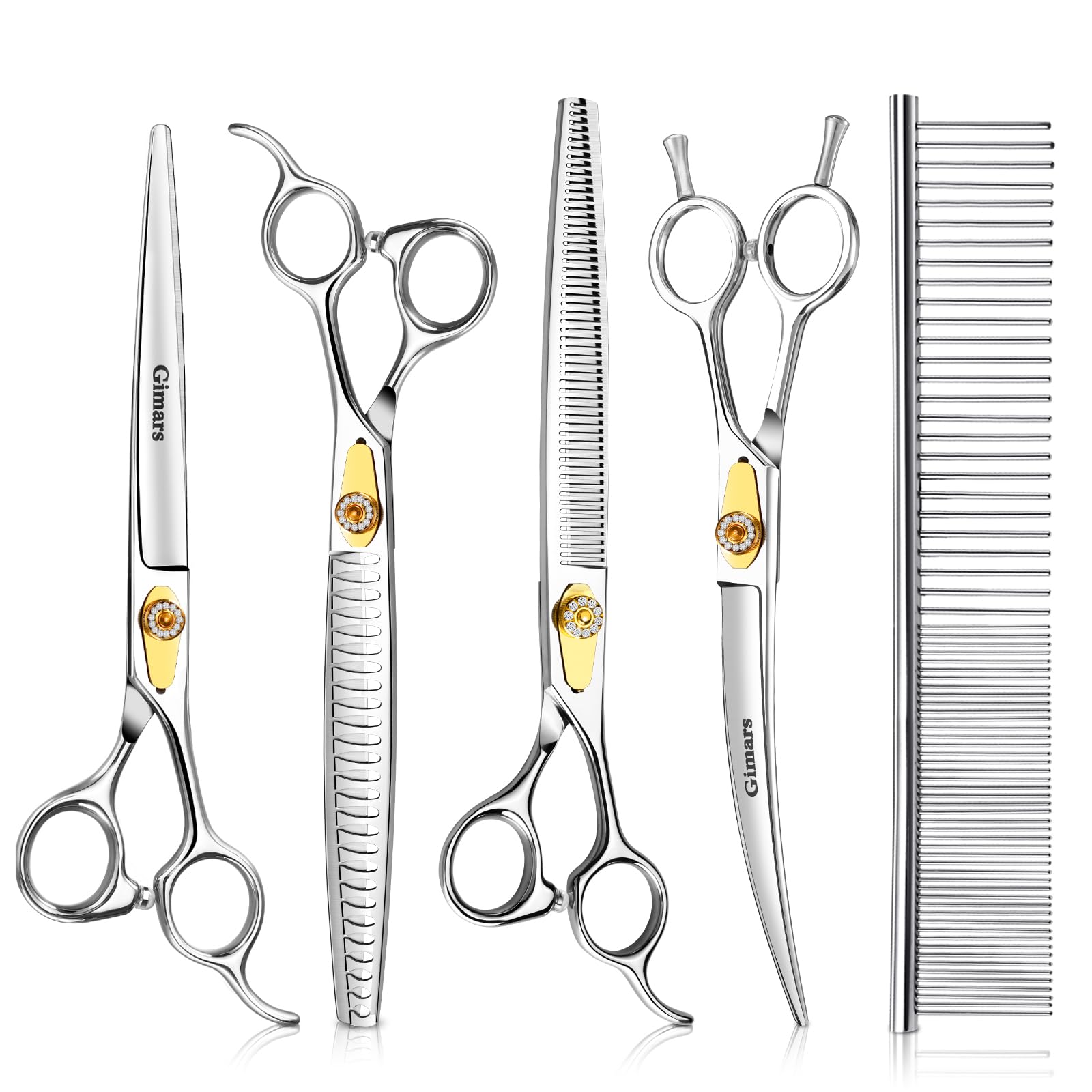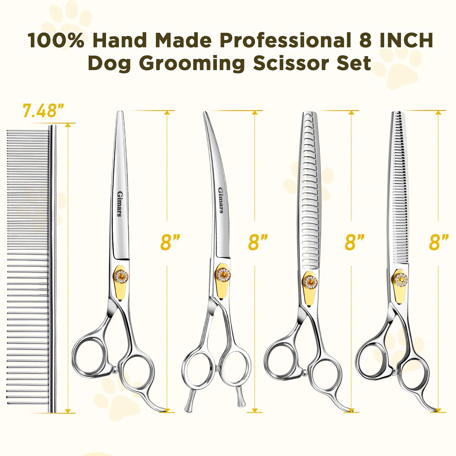 Gimars 8 Inch Professional 440C Stainless Steel Dog Grooming Scissors Heavy Duty 6 In 1 - Straight, Thinning, Chunker, Curved Shears and Comb, Ergonomic Pet Grooming Scissor for Dogs, Cats
