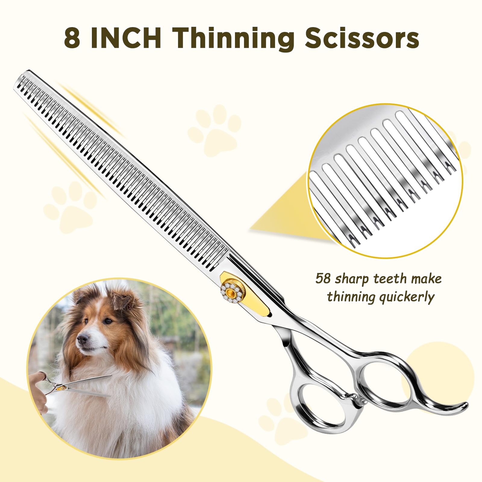 - Complete dog grooming scissors set: This set includes everything you need for a comprehensive grooming session: 8-inch straight scissors, 8-inch thinning scissors, 8-inch curved scissors, 8-inch chunker, a storage case, a cleaning cloth, and a stainless steel comb (comb color may vary). Perfect for all your grooming needs!