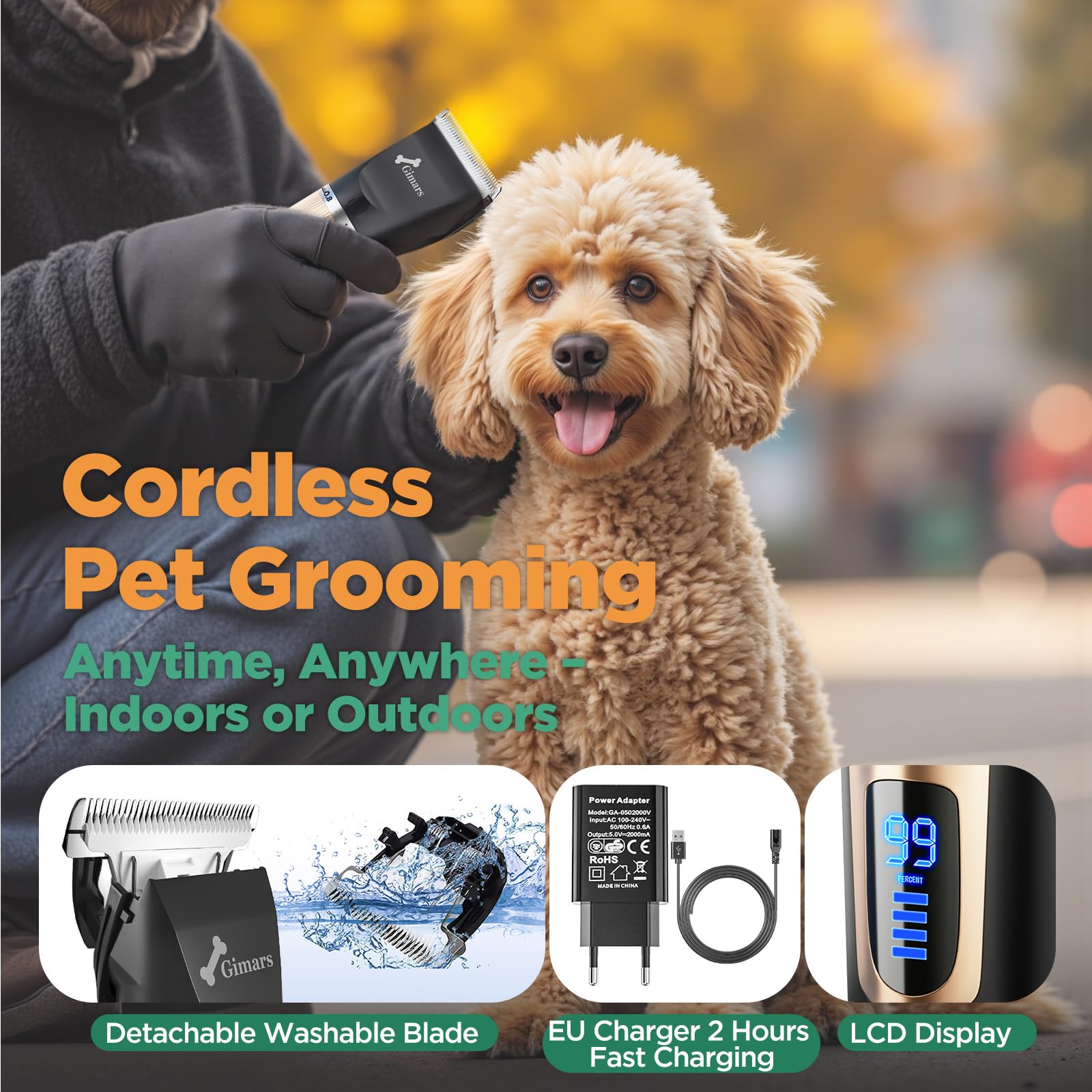• 【2-Hour Fast Charge & Cordless Operation】 Rechargeable Gimars Clipper charges fully in just 2 hours with the included EU adapter and USB cable, compatible with various charging options. Gimars Clipper can be used continuously for 120 minutes, sufficient to groom large dogs or horses. Cordless design prevents tangling and the risk of pets biting the cord, suitable for indoor and outdoor use. An LCD screen displays battery life and charging status. Gimars Clipper also supports wired operation.
